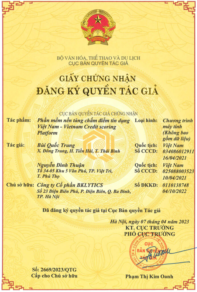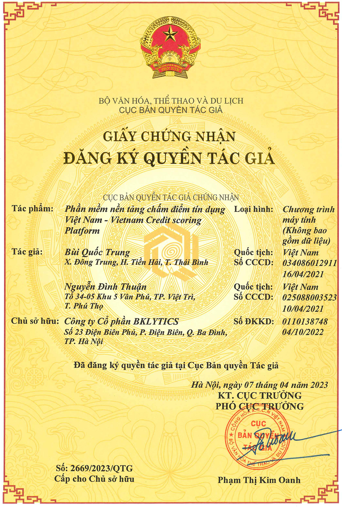 Bklytics đã phối hợp với Trung tâm Ứng dụng Dữ liệu dân cư và Căn cước công dân (Trung tâm RAR) để thử nghiệm giải pháp chấm điểm RBCredit được xây dựng trên nền tảng VCS với một phần dữ liệu dân cư (không công khai danh tính cá nhân). Điểm tín dụng tạo ra bởi RBCredit đã được kiểm tra, đánh giá chất lượng bởi các ngân hàng, công ty tài chính uy tín như: Mcredit (thuộc Tập đoàn MBBank), PVCombank, Datanest (tiền thân là CIC Data). Các đơn vị tham gia đánh giá, thử nghiệm đều có nguyện vọng sử dụng sản phẩm RBCredit trong hoạt động nghiệp vụ.
